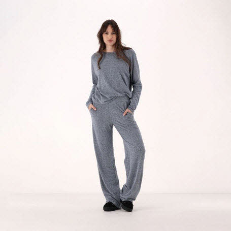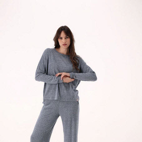 Langärmeliger Damenpullover mit lockerer Passform und Bateau-Ausschnitt; hergestellt aus weichem Peach-Touch-Melange-Jersey, der nicht gebügelt werden muss. Ideal für feminine Looks oder lässige Outfits, die Eleganz und Komfort verbinden.