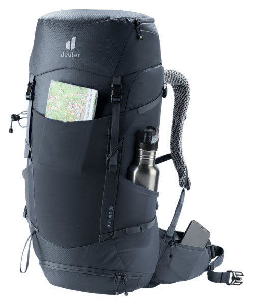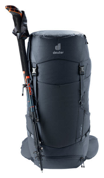 Die Stöcke lassen sich vorne am Rucksackträger befestigen und sind somit direkt während des Gehens zugänglich. Eine große Stretchaußentasche mit zusätzlichem seitlichem Zugriff ermöglicht es, Gegenstände, wie eine Trinkflasche bequem zu greifen, ohne den Rucksack abzusetzen. Zusätzlich sorgen zwei Hüftflossentaschen, zwei Deckelfächer, ein separates Bodenfach und ein großes Stretchfach an der Vorderseite für optimale Organisation. Der geräumige Zugang über den Toploader bietet schnellen Zugriff zum Innenfach.