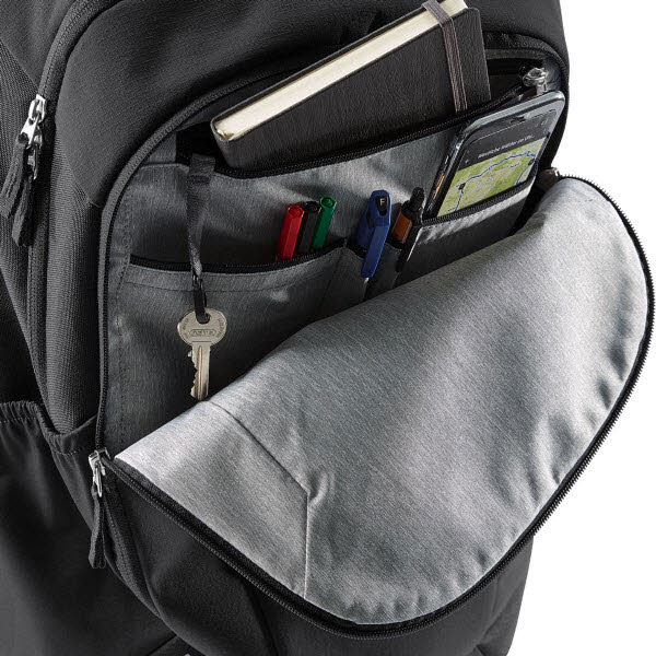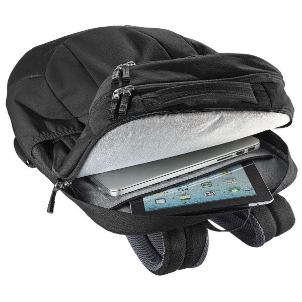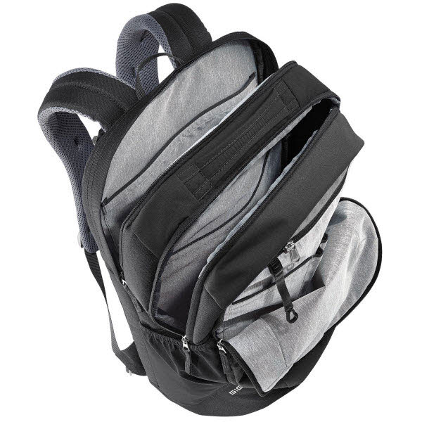 Der Clou beim Deuter Giga Rucksack ist das raffinierte Innenleben: Neben einem geräumigen, unterteilten Hauptfach verfügt der Rucksack über ein weiteres, abgetrenntes Fach speziell für Laptops bis 17" Größe sowie Tablets. Dazu kommt eine große Vortasche, die als Organisationsfach konzipiert wurde und beispielsweise Schreibutensilien stets griffbereit hält. Egal ob DIN A4-Block, Dokumente oder Ordner - auch große Büromaterialien finden im Giga Rucksack problemlos Platz.