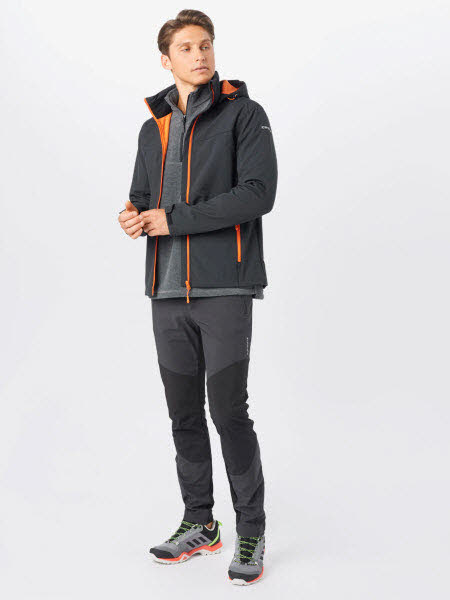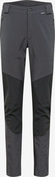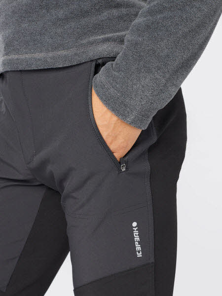 Die Front der ICEPEAK-Outdoorhose besteht aus Softshell-Material, das vor Wasser und kräftigem Gegenwind schützt, während der hintere Teil aus Thermostretch wärmt und jede Bewegung unbegrenzt mitmacht. Dank der schmalen Passform ist es leicht, zusätzliche Kleidungsschichten über die Hose anzuziehen, wenn man eine Pause einlegt oder wenn es das Wetter verlangt. Vorne gibt es Reißverschlusstaschen und der Bund ist hinten erhöht, um den unteren Rücken besser abzudecken.