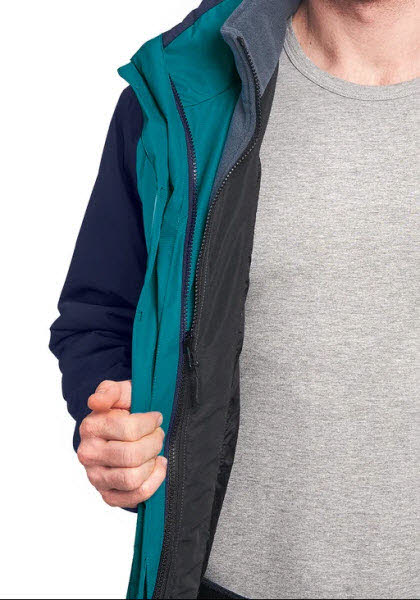 Denn die Gregale DJ hat mit ihrer Konstruktion als funktionelle Doppeljacke mehr zu bieten als von außen zu sehen ist. Beginnen wir bei der Außenjacke. Sie ist wind- und wasserdicht sowie atmungsaktiv. Dafür sorgt die mTEX 10.000 Membrane. Die umweltfreundliche PFC-freie Imprägnierung lässt Wassertropfen und Schneekristalle abperlen und die einstellbare Kapuze trotzt Wind und Wetter. Solo hast du damit eine überzeugende Wanderjacke, die dich vor widrigem Wetter schützt. Wird's richtig kalt und stürmisch, freust du dich über die herausnehmbare Fleece-Innenjacke, die du auch alleine tragen kannst. Da sie viel isolierende Luft einschließen kann, hält sie dich schön warm. Solo – und im Verbund mit der hinten länger geschnittenen Außenjacke noch viel mehr. Diese ist übrigens mit einem Netzfutter ausgesttat, das über die dreifach aktive Frischeausrüstung Silverplus® verfügt. Damit haben unangenehme Gerüche keine Chance. Die Gregale DJ ist eine 3-in-1-Jacke, die diesen Namen wirklich verdient.